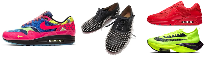 - 派手、ハリハリ、原色系のブランド靴が多い